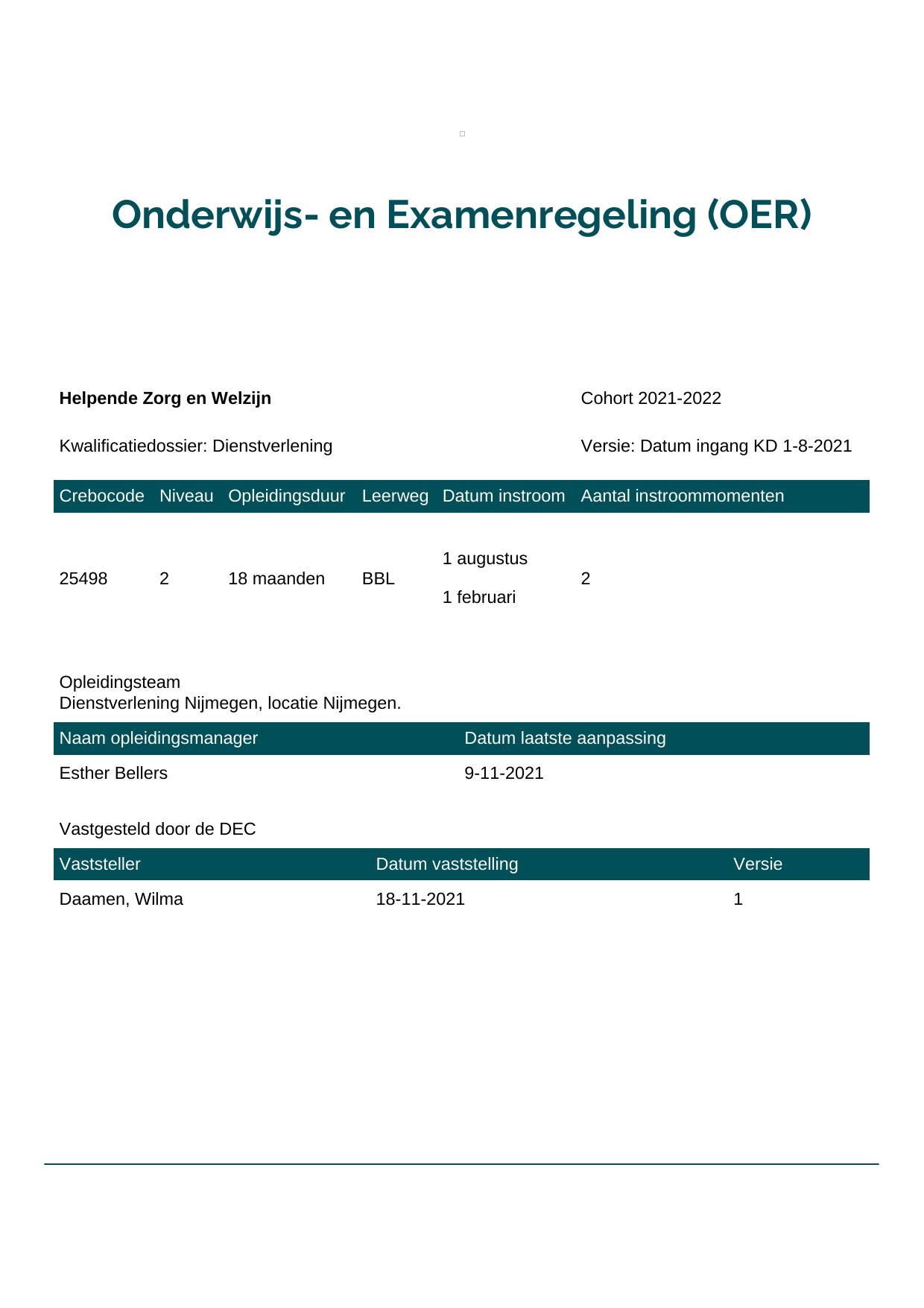 Helpende Zorg en Welzijn 25498BBL-NYM in cohort 2021-2022