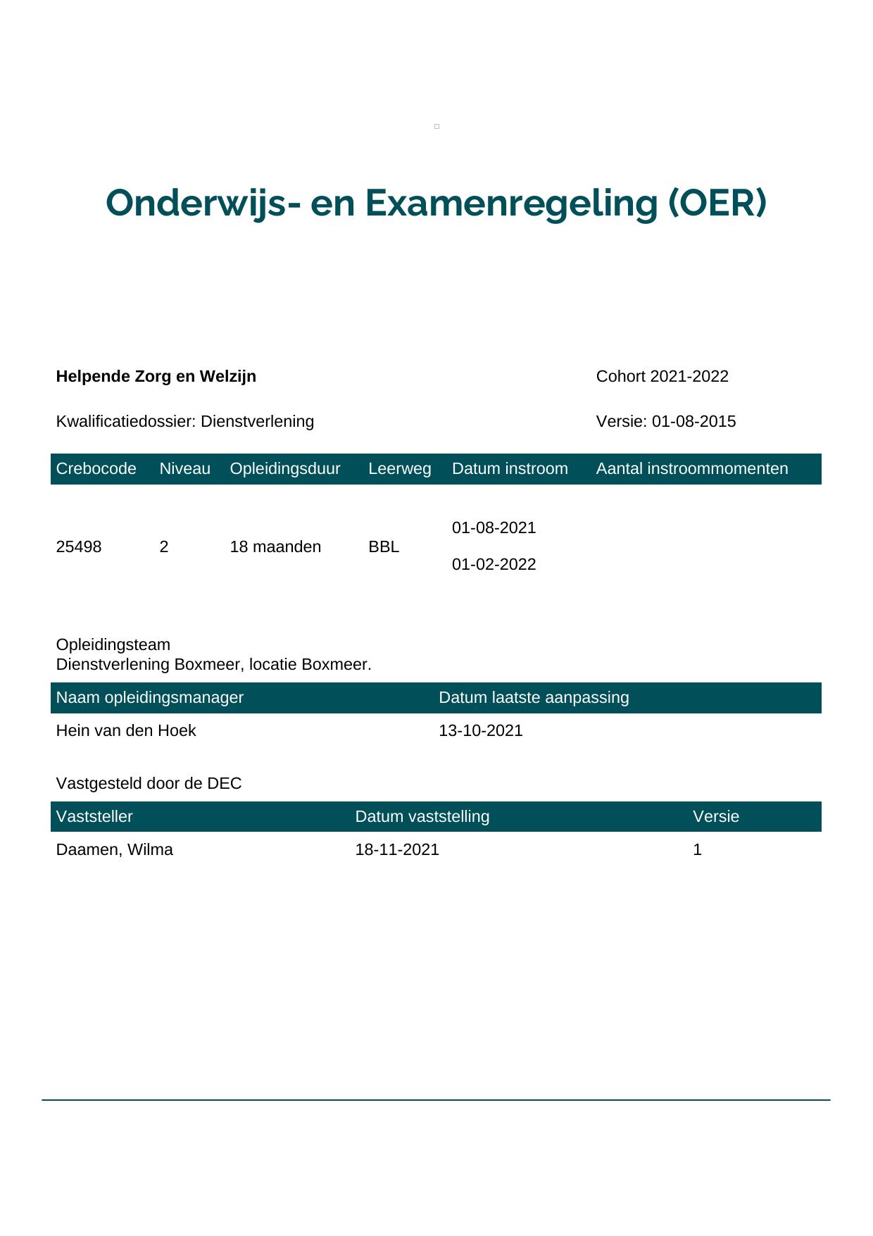 Helpende Zorg en Welzijn 25498BBL-BOX in cohort 2021-2022