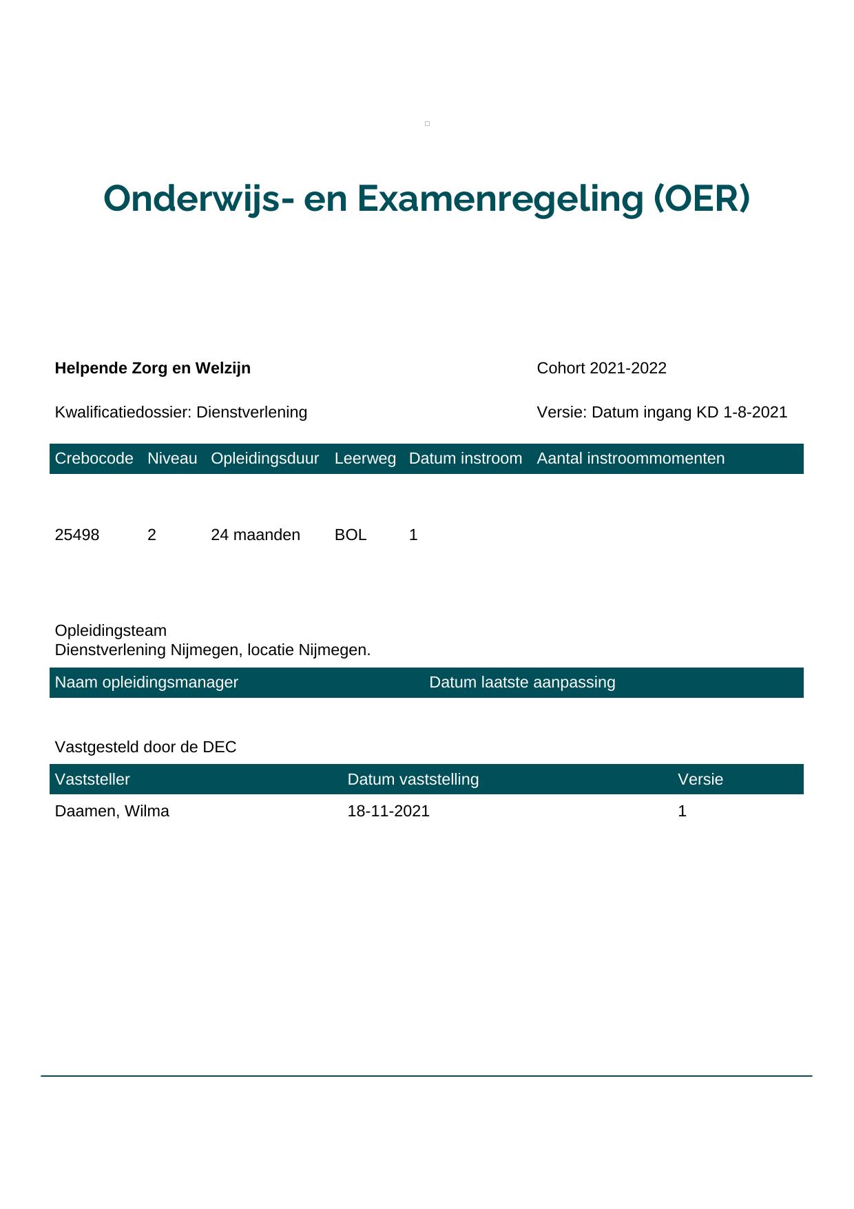 Helpende Zorg en Welzijn 25498BOL-NYM in cohort 2021-2022