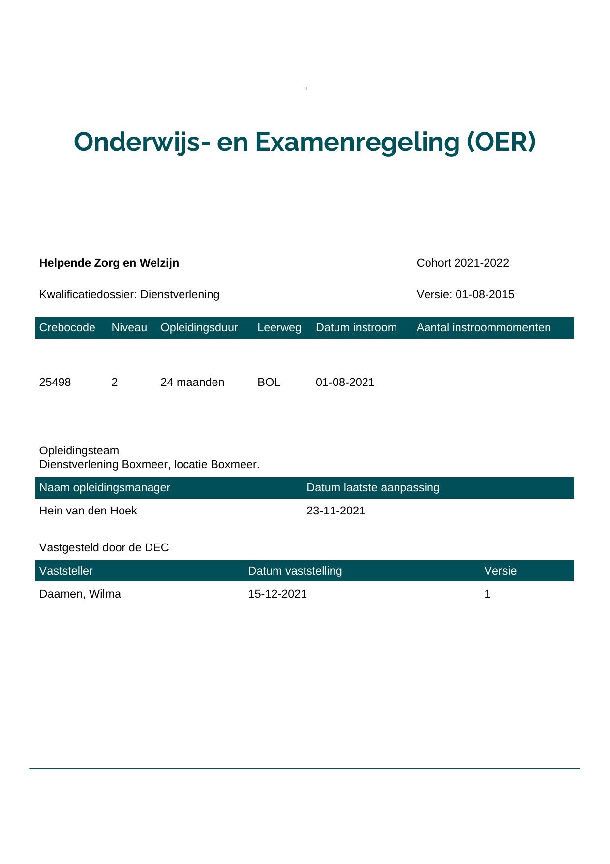 Helpende Zorg en Welzijn 25498BOL-BOX in cohort 2021-2022