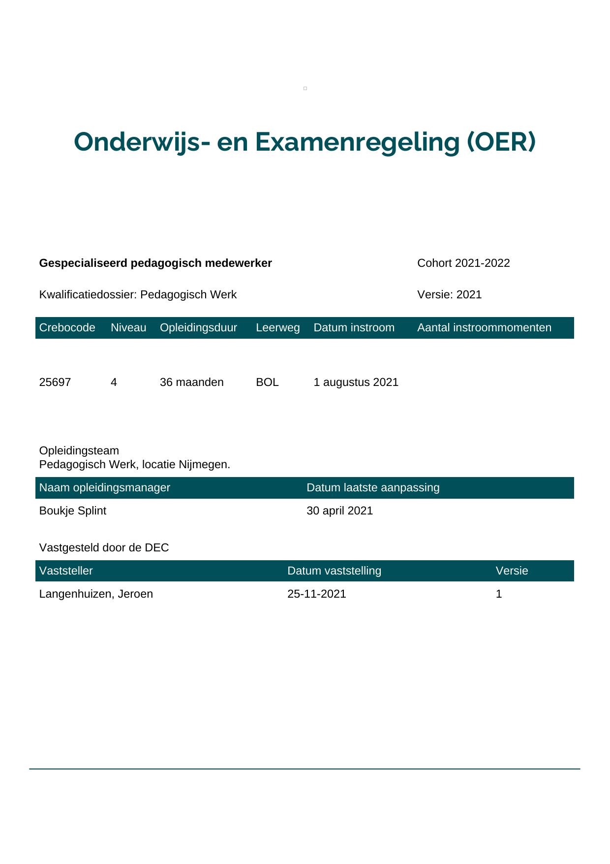 Gespecialiseerd pedagogisch medewerker 25697BOL-NYM in cohort 2021-2022