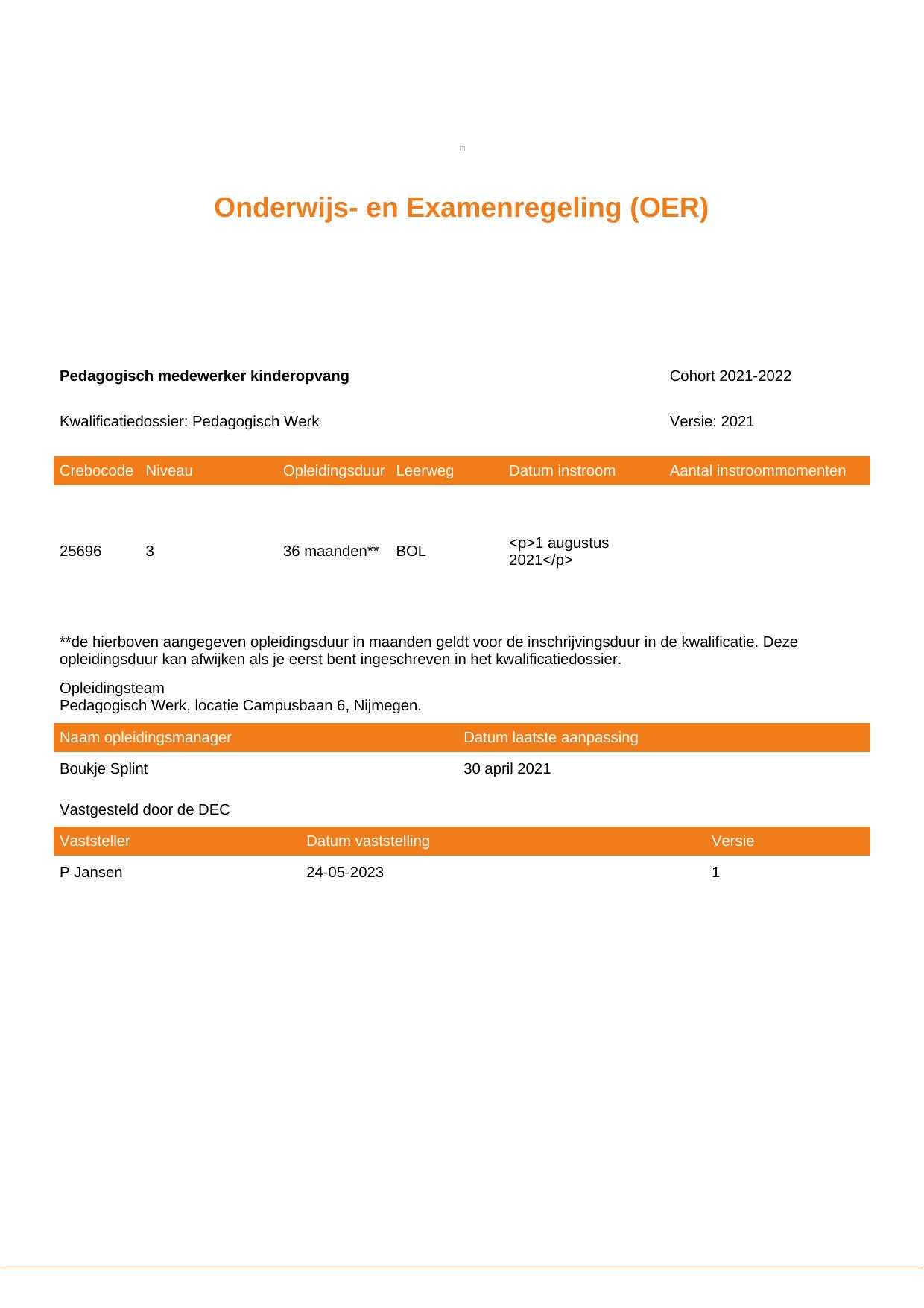 Pedagogisch medewerker kinderopvang 25696BOL-NYM in cohort 2021-2022
